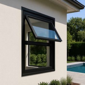 An awning window is top-hinged and opens outward from the bottom, providing ventilation while helping shield the opening from light rain.